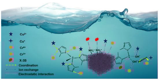 The aerogel is used in the adsorption process due to its high porosity, large surface area, and adjustable framework. The process of adsorption for the removal of contaminants such as dyes or heavy metal ions from wastewater can be achieved because of the availability of pore space, and the adsorption capacity can be enhanced by grafting and incorporating solid adsorbents [85]. The functional groups in the polysaccharide structure itself can also provide functionalities for adsorption. For instance, chitosan has abundant amine (NH) and hydroxyl (OH) groups that contribute space for ion exchange with heavy metal ions and anionic organic pollutants [126]. The recyclability of polysaccharide aerogels could be improved by developing magnetic carboxymethyl chitosan (Fe3O4@chitosan) via a mussel-inspired polydopamine chemistry with a glutaraldehyde crosslinker [127]. In another study, a graphene oxide (GO)/aminated lignin aerogel was able to remove 91.72% of dyes. The improvement of the absorption efficiency was attributed to the cross-linking between the lignin and GO, which also provides a supporting skeleton and increases the specific surface area [128]. In addition, the hydrophobic modification of the cellulose fiber provides a low surface energy, thus generating a porous sponge that can adsorb more organic solvents and oils from polluted water [19,21,63]. For sustainable design, an important criterion of a good adsorbent is its reusability. In this respect, cellulose aerogel has been shown to be reusable for up to 10 times after the adsorption of oil, with a 12.55% decrease in efficiency [3]. In adsorption experiments, the effect of pH, contact time, initial concentration, adsorbent dosage and ionic strength should also be considered. For example, a multifunctional composite aerogel adsorbent has been developed from zeolite imidazolate framework-67 (ZIF-67) by the modification of the metal–organic framework (MOF) with bacterial cellulose/chitosan (BC/CH) using the facile methods of physical mixing, in-situ synthesis, and lyophilization [24]. It was reported that the adsorption capacities of the composite aerogels for Cu2+ and Cr6+ were 200.6 mg/g and 152.1 mg/g, respectively. In addition, the good potential of the material for use in wastewater treatment was demonstrated by a 100% removal of the active dye, red X-38. This is because the incorporation of MOF increased the porosity of the BC/CH aerogel, thus providing additional space for adsorption [22]. Figure 11 shows the removal process of various metal ions using the three distinct methods of coordination, ion exchange, and electrostatic interactions with the ZIF-67/BC/CH aerogel. Thus, the Cu2+ and Cr6+ can become attached to the aerogel via both coordination and ion exchange, while the adsorption of X-38 occurs through the electrostatic interaction.
