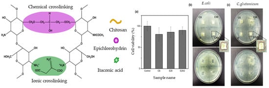 Figure 12. Schematic representation of chitosan/epichlorohydrin/itaconic acid for wound dressing (testing on cell viability and antibacterial activities. (a) cell viability of the aerogels against HT29 by MTT assay, and inhibition zones of the aerogels against (b) E. coli, (c) C. glutamicum for actibacterial activities. Reproduced from reference [61] with permission. Copyright 2020 Elsevier.