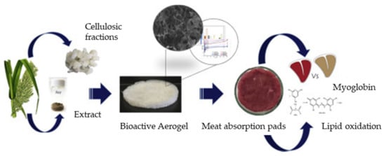 Figure 13. Schematic representation of a cellulose-based aerogel extracted from A. donox biomass for food packaging (antioxidant effect on meat). Reproduced from reference [132] with permission. Copyright 2020 Elsevier.