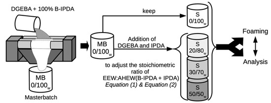 Before foaming, the mold was treated with the release agent and the MB was defrosted at 40 °C for 10 min. As the stoichiometric amount of B-IPDA (corresponding to DGEBA 0/100w IPDA/B-IPDA) was already included in the MB, further amounts of DGEBA were added to the MB in order to achieve the required lower ratios of 20/80w, 30/70w and 50/50w IPDA/B-IPDA. The corresponding amount of IPDA was also added to the MB. The workflow is shown in Figure 2.