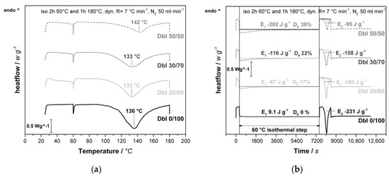 In the DSC experiments, two exothermal peaks can be observed. The first one in the range of 20 to 60 °C (Figure 3a) is related to the pre-curing of the systems, while the second one is related to the decomposition of the carbamate and further curing with the released IPDA. The onset is dependent on the blend system and can be observed at around 90 °C, whereas the actual reaction is expected to start at a lower temperature, as found in our previous study [25]. The peaks are in the range between 133 and 142 °C, depending on the blend ratio. The shift can be explained by the diffusion of the released IPDA, which is highest at DbI 20/80w and DbI 30/70w, while the high pre-curing degree at DbI 50/50w lowers the diffusion.