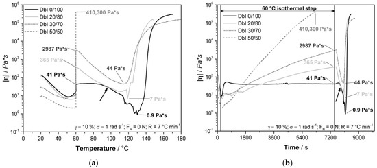 The overall trend of the rheological experiments matches well with the DSC results. The observed differences between DSC and rheology can be explained by the methodology of the measurement, as the DSC focuses on changes in the energy flow, while the rheometer physically applies shearing to the system and detects the response. In general, the initial viscosity decreases with increasing amounts of IPDA due to its lower viscosity and less solid B-IPDA filler content. The viscosity is increased up to different levels during isothermal pre-curing, with a subsequent drop caused by further temperature increases and carbamate decomposition, releasing CO2 which provides plasticizing effects (Figure 3a). Afterwards, the rising foam structure disturbs the measurement, resulting in different slopes and further noise due to some material being pushed out of the measurement gap. After an initial re-orientation of the system, the DbI 0/100w sample shows a constant viscosity value of around 41 Pa × s during the 2h pre-curing time, which is lower compared to the initial viscosity at 25 °C with 136 Pa × s due to the temperature influence (Figure 4b). Thus, combined with the DSC results, the latent characteristics of the B-IPDA can be confirmed.