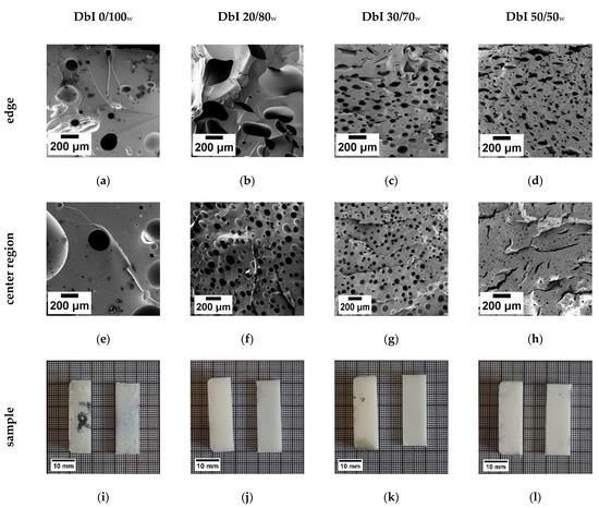 SEM pictures of the DbI systems with blend ratios of 0/100w (a,e,i), 20/80w (b,f,j), 30/70w (c,g,k) and 50/50w (d,h,l). The edge region is presented in the images (a–d), the core region in (e,f) and the foam sample in (i–l) from top side (left) and cross section (right).