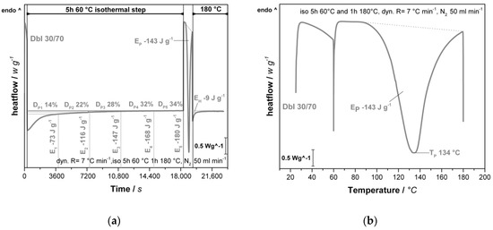 DSC investigations of the DbI 30/70w system pre-cured for 5 h at 60 °C with process-related heating rates showing (a) time-dependent heat flow with indicated energy (Ex) released at specific pre-curing times with corresponding calculated pre-curing degree (DPX) in a 5 h pre-curing experiment. Ep corresponds to the energy released at the peak of the dynamic step and EH to the energy released at 180 °C (b) Temperature-related heat flow with indicated EP and reaction peak temperature (TP).