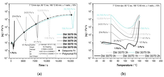 Investigations of the DbI 30/70w system with different pre-curing times at 60 °C with process-related heating rates showing different (a) time dependence of viscosity for different foaming experiments with polynomial fit of maximum viscosities after pre-curing and (b) temperature dependence of viscosity for different foaming experiments, plotted up to 140 °C due to increased noise effects at higher temperatures.
