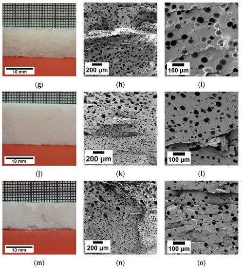 Pictures of the DbI 30/70w systems which were pre-cured for different times of (a–c) 0 h; (d–f) 1 h; (g–i) 2 h; (j–l) 3 h and (m–o) 5 h at 60 °C and further cured and foamed for 1 h at 180 °C. The samples in the photos are orientated in expansion direction, except (a), which shows the top side view due to low expansion and to illustrate the bubbles formed, and (b), which shows the side view to illustrate the low expansion.