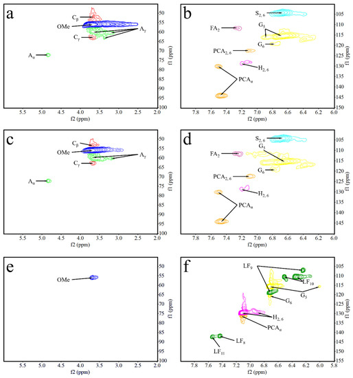 2D-HSQC spectra of EHL, HEHL, model compounds samples: (a) Side-chain (δC/δH 45−100/2.00−6.00) regions of EHL, (b) aromatic (δC/δH 100−150/6.00−8.00) regions of EHL, (c) Side-chain (δC/δH 45−100/2.00−6.00) regions of HEHL, (d) aromatic (δC/δH 100−150/6.00−8.00) regions of HEHL, (e) Side-chain (δC/δH 45−100/2.00−6.00) regions of model compounds, and (f) aromatic (δC/δH 100−150/6.00−8.00) regions of model compounds.
