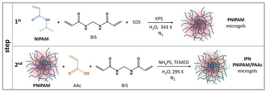 Sketch of the two steps free radical polymerization method for synthesis of IPN microgels.