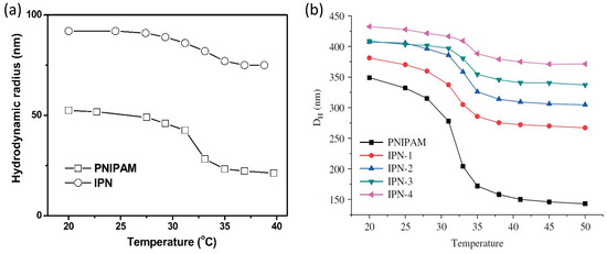Temperature dependence for diluted PNIPAM and IPN microgel dispersions at pH = 7.0 of (a) hydrodynamic radii and (b) hydrodynamic diameters at difference PAAc contents (increasing from IPN-1 to IPN-4). Figures adapted with permission from Refs. [59,61], respectively. Ref. [59], Copyright 2021 American Chemical Society.