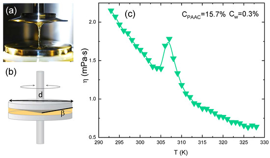 (a) Picture of the cone-plate geometry used to perform rheological measurements. (b) Schematic rapresentation of the used geometry (c) Viscosity of IPN microgels with = 15.7% as a function of temperature at = 0.3%, pH = 5.5 and = 10 s.