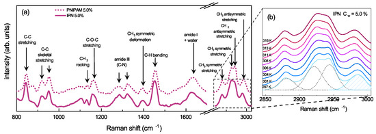 The shrinking of PNIPAM-based microgels across the VPTT has been reported to involve molecular changes that can be probed by Raman spectroscopy [92]. Raman spectra of both PNIPAM and IPN microgels (Figure 8a) are indeed dominated by the contributions associated to C-C and C-H vibrational modes, mainly derived from NIPAM [93]. In particular the stretching bands in the 2850 and 3000 cm spectral region, ascribed to vibrations of the CH and CH groups in the isopropyl moiety (Figure 2a), have been reported to be sensitive to hydrogen bond variations involving the amide functionality. In order to deep inside the interaction mechanism driving the VPT of PNIPAM and IPN microgels, the four superimposed bands in the indicated spectral region have been deconvoluted with four Gaussian contributions (Figure 8b). These contributions have been assigned to the following mode of PNIPAM in the hydrated state (T = 297 K) [94,95]: symmetric stretching of CH (2880 cm), symmetric and antisymmetric stretching of CH (2920 cm and 2945 cm, respectively), antisymmetric stretching of CH (2988 cm). The intensity ratio between the symmetric and antisymmetric CH stretching modes of the methylene group (lower and higher frequency central peaks, respectively), is usually related to the lateral packing density of the polymer chains [96] and any changes can be exploited to study variation in the polymer/polymer and polymer/solvent interactions. In particular, the observed increase of the intensity ratio across the VPTT in IPN microgels suggests that the coil-to-globule transition of PNIPAM induces an increase of the packing density in the shrunken state even when PAAc is interpenetrated within the PNIPAM network.