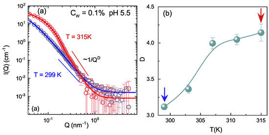 (a) SANS scattered intensity for IPN microgels at C = 13.6% in DO at = 0.1% and pH 5.5 for two temperatures: T = 299 K and T = 311 K, respectively, below and above the VPTT. Full lines are fits according to Equation (3). (b) Porod exponent, D, as a function of temperature as obtained through fits with Equation (3).