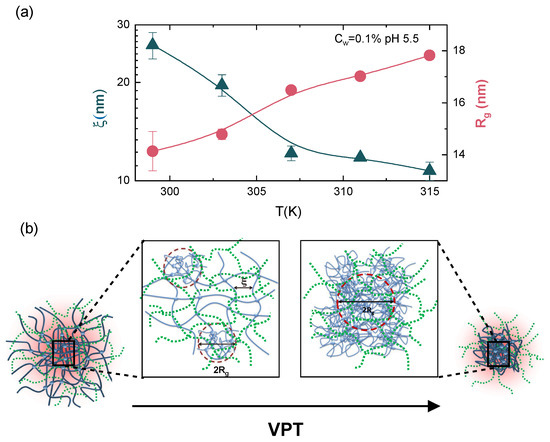 The Porod exponent reported in Figure 10b, which gives an estimation of the roughness of the domain interfaces, increases above the VPTT, indicating the formation of smoother interfaces between different domains. The local intra-particle structural response to temperature across the VPT has been rationalized by looking at the behaviour of the correlation lengths and of the mean size of the inhomogeneities domains , reported in Figure 11a at fixed concentration and pH, as an example. The correlation length values are much smaller with respect to particle dimensions (Figure 6b) and decrease above the VPTT, when microgel particles collapse and the lost of individuality of the frozen blobs gives rise to a large cluster of cross-linked points of size . Therefore, when the system undergoes the macroscopic transition from the swollen to the shrunken state, the local structure experiences a transition from an inhomogeneous structure, where the lattice is deformed and the open network can accommodate large amount of water, to a porous solid-like structure, where a unique larger sized cluster is formed and the nanometric structure of the tridimensional network is lost, due to the shrinking of the polymer chains along with water expulsion (see Figure 11b).
