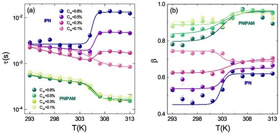 The temperature behaviour of the structural relaxation time and the shape parameter have been obtained by fitting the from DLS measurements with Equation (1), for both PNIPAM and IPN microgels at four weight concentrations (C = 0.1%, C = 0.3%, C = 0.5% and C = 0.8%) (Figure 12). For pure PNIPAM microgels the dynamical transition associated to the VPT is observed in the whole concentration range: the structural relaxation time slightly decreases with increasing temperature up to the VPTT, where the fastening of the dynamics related to the reduced size of particles is observed (Figure 12a) [62,64]. In the case of IPN microgels a more fascinating scenario shows up. At the lowest investigated concentration () the structural relaxation time slightly decreases as temperature increases up to the VPTT where a transition to its lowest value takes place as in the case of pure PNIPAM microgels. However, as increases the structural relaxation time above the VPTT suddenly grows up, indicating a slowing down of the dynamics and the formation of aggregates. This behaviour is more pronounced higher is the sample concentration and is accompanied by a viscosity increase, which is clearly observed by eyes. The dynamical transition associated to the VPT is also observed in the discontinuous temperature behaviour of the parameter that gives a measure of the structural relaxation times distribution and is therefore the most reliable marker for sample polydispersity. This can be an intrinsic polydispersity, due to the synthesis procedure and therefore variable from sample to sample but can also be an “apparent” polydispersity that may be explained in terms of fluctuations of the particle shape at different temperatures and weight concentrations or as a result of particle aggregation (Figure 12b). In PNIPAM microgels the sample polydispersity increases with increasing , as indicated by the concentration dependence of the parameter at temperatures below the VPTT. Above the VPTT no differences depending on are observed suggesting that PNIPAM microgels in the shrunken state have low polidispersity regardless to their concentrations. A similar behaviour is also found for IPN microgels even if the more complex inner structure of IPN particles reflects in a higher polydispersity and lower values than those for PNIPAM microgels. Intriguing differences on concentration are also observed: for C 0.3% decreases upon crossing the VPTT, while for C 0.3% it increases with a more and more pronounced jump across the VPT with increasing concentration.