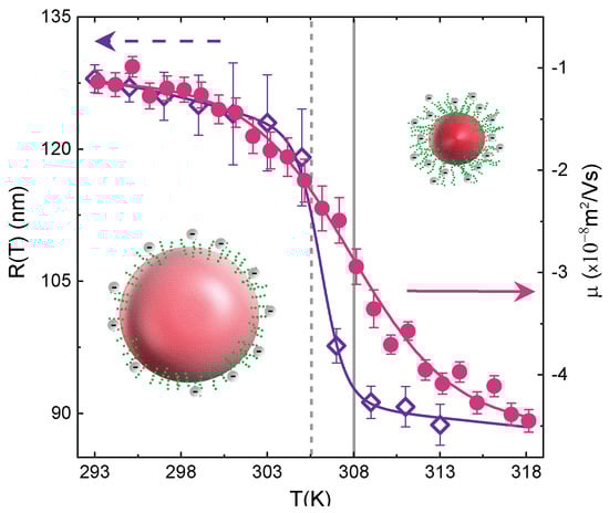 Comparison between electrophoretic mobility and hydrodynamic radius for IPN microgel at C = 19.2%, low weight concentrations ( = 0.05% for electrophoretic mobility and = 0.01% for DLS measurements) and pH = 5.5. Vertical dashed lines represent the VPT temperature ≈ 305 K and the electrophoretic transition temperature T≈ 308 K.
