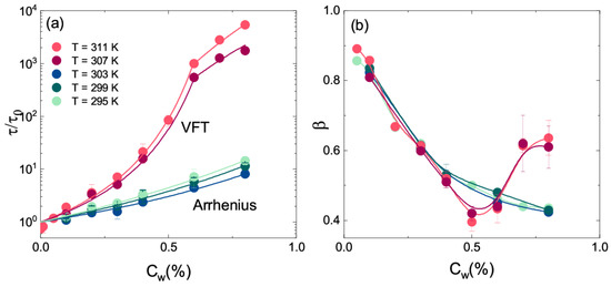 where A is a constant and is the characteristic structural relaxation time for low values. Above the VPTT, the concentration dependence of the structural relaxation time is well described by a super–Arrhenius behaviour, usually modelled by the Vogel–Fulcher–Tammann (VFT) equation: