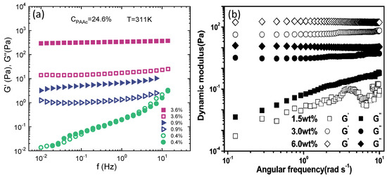The existence of different regimes is also evidenced by the behaviour of the storage and loss moduli vs. frequency f reported in Figure 15 above the VPT for three different concentrations. In Figure 15a, and vs. f for a sample at C = 24.6% and T = 311 K are shown. At C = 0.4% the power low behaviour of the moduli is typical of the liquid state, as C is increased, at C = 0.9%, above the glass transition concentration found by the VFT model for the structural relaxation time, > over the entire frequency range indicating a viscoelastic behaviour typical of a solid like system. For this concentration the plateau modulus is not perfectly constant indicating a weak solid-like behaviour as deeply explained in Ref. [76]. A further increase of moduli is observed at C = 3.6%, they are frequency independentand and revealing a solid like response of the system that indicates the existence of another state [76]. These results are in good agreement with measurements from Ref. [59] at T = 310 K reported in Figure 15b where the open and closed symbols for and are inverted with respect to Figure 15a.
