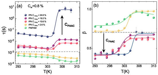 In order to understand the PAAc role on the aggregation process across the VPT, the temperature behaviour of the structural relaxation time and the parameter at different PAAc content has been explored through DLS. In Figure 16a, the well known dynamical transition associated to the particle shrinking is evidenced for both PNIPAM and IPN microgels [62,64] together with two opposite temperature behaviours above the VPTT: decreases for PNIPAM and IPN at the lowest investigated PAAc content while it increases for IPN samples at higher , with a very significant growth at the highest . Furthermore, the parameter, reported in Figure 16b, clearly points out the strong influence of the PAAc concentration. Three different trends can be observed indeed, one for PNIPAM and IPN at the lowest , one for IPN with intermediate and the latter for IPN at the highest = 24.6%. PAAc therefore represents a good experimental control parameter for tuning inter-particle interactions and aggregation: the higher the amount of acrylic acid interpenetrating the PNIPAM network, the more the aggregation and the viscosity increase are favoured.