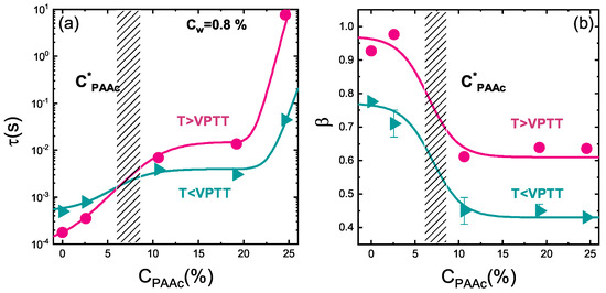 To highlight these dynamical changes related to the interpenetration of the poly (acrylic acid) within the PNIPAM network, one can compare the behaviours of the structural relaxation time and the shape parameter as a function of PAAc content, at temperature below and above the VPTT (Figure 17a,b). The jump in a range of = (2.6 ÷ 10.6)% points out a cross-over between two different regions, with a critical value of PAAc content expected in the range = (7 ÷ 8)%: below this IPN microgels at pH 5.5 behave very similarly to pure PNIPAM microgel, indicating that the charges influence is negligible, while above the effect of PAAc, and therefore of charge density, becomes relevant, leading to a slowing down of the dynamics (increase of the structural relaxation time) and an enhancement of polydispersity (decrease of the parameter). At even higher PAAc content the structural relaxation time suddenly grows up as a consequence of the larger aggregates formation eventually clustering in a percolating network while the parameter is not changing significantly. This scenario is maintained above the VPTT where however the parameter is increased, indicating that in the collapsed state the sample polidispersity decreases, as previously discussed.