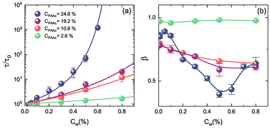 To better emphasize how the PAAc content affects the dynamics of the system, the normalised structural relaxation time and the parameter at temperature above the VPTT (T = 311 K) are reported in Figure 18 as a function of weight concentration at different PAAc contents. The higher is the PAAc content the stronger is the concentration dependence of the normalised structural relaxation time with divergence at high concentration (Figure 18a). The effect of PAAc on the parameter is even more dramatic (Figure 18b), with the appearance of a minimum connected with the emerging of distinct anomalous mechanisms for particle motion [74]. These results point out that, by changing PAAc content, different dynamical behaviours can be achieved in microgels due to the increasing interactions of COOH groups belonging to PAAc chains [73].