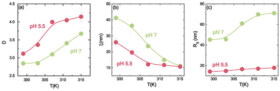 In the previous subsection, it has been shown how the behaviour of IPN microgels depends on PAAc content. However, since PAAc is strongly pH-responsive we can expect that IPN microgels are also strongly affected by pH variations. As an example the temperature behaviour of the local structure (discussed in Section 3.3) shows interesting differences at acidic and neutral pH. The behaviour of the Porod exponent D and of the correlation length as a function of temperature (Figure 20a,b, respectively) highlights how the transition from an inhomogeneous to a porous solid-like structure across the VPT depends on pH. Moreover, the gyration radius (Figure 20c) increases with temperature in both acidic and neutral pH conditions, but at pH 7 an evident discontinuity shows up at T≈305 K, around the expected VPTT. On the contrary at pH 5 the differences between inhomogeneities domains are partially lost and the temperature responsiveness of the system is limited by the presence of the PAAc chains. The sharper transition observed at neutral pH with respect to that at acidic pH is related to the solvation in water of the PAAc chains at pH values above 5.5, due to its deprotonation. Indeed at low pH the PAAc chains are not effectively solvated by water, thus the formation of H-bonds between PAAc and PNIPAM is favoured and introduces spatial constraints which limit the PNIPAM network swelling. At neutral pH the deprotonation of the PAAc chains results in their effective hydration and the two networks are independent, with a complete regain of the swelling capability of the system.