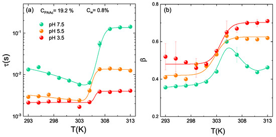 where b is the coherence factor, is an “effective” structural relaxation time and describes the deviation from the simple exponential decay ( = 1), usually found in monodisperse systems, and gives a measure of the structural relaxation times distribution due to sample polydispersity. DLS measurements have been performed in the temperature range T = (293–313) K, at different PAAc content ( = 2.6%, 10.6%, 13.6%, 15.7% 19.2%, 24.6%) and three pH values (pH = 3.5, 5.5, 7.5) as a function of the weight concentration.