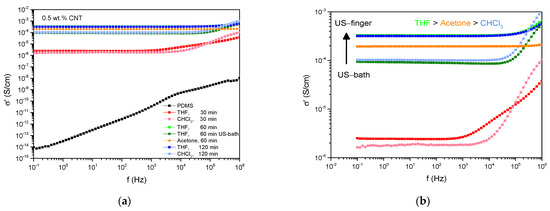 As an appropriate pre-dispersion step enables to break up CNT agglomerates due to the decrease of particle–particle interactions, different pre-dispersion approaches were investigated in this study. After the pre-dispersion step, the subsequent compounding was performed at optimum conditions according to [11] to combine the enhancement in filler dispersion by pre-dispersion and by the agglomerate breakage arising from shear forces. To realize the pre-dispersion step, ultrasonication was applied using different techniques, conditions, and solvents. Figure 1 displays the electrical conductivity against frequency depending on the ultrasonic terms in PDMS/CNT compounds with 0.5 wt.% of CNTs. The composite filled with 0.5 wt.% CNT without pretreatment is insulating itself. By implementing a pre-dispersion step, an enormous increase in conductivity can be observed for all samples ending up in percolated systems. As the CNT amount remains unchanged, this indicates decreased filler–filler interactions and improved agglomerate break-up due to the pre-dispersion step in consequence. Concurrent to this, decreased filler–filler interactions increase the contact area between the polymer and the filler which increases CNT-PDMS bonding options and therefore polymer–filler interactions.