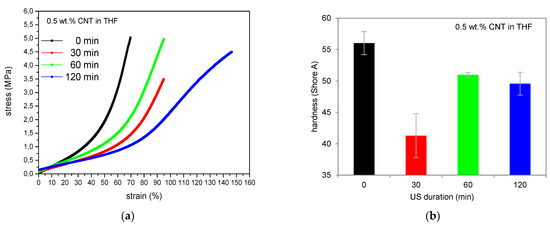 Analyzing the stress–strain curves regarding the ultrasonic duration, maximum tensile strength can be observed at 60 min. Here, CNTs are dispersed best which partially compensates the softening effect. This is evident by an equivalent reinforcement compared to the initial level of the sample with untreated CNTs due to the enhanced dispersion and subsequent filler–polymer bonding.