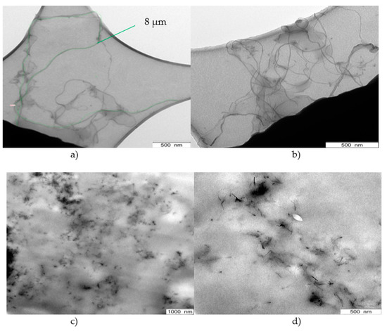 Transmission electron microscopic (TEM) images are shown in Figure 3 in order to have a direct look on the filler agglomerates. Figure 3a,b illustrate CNTs dispersed in THF (60 min, US-finger) and applied on a copper grid directly. Effective agglomerate break-up can be observed here, where separated carbon nanotubes exist. These CNTs hold a length of up to 8 µm.