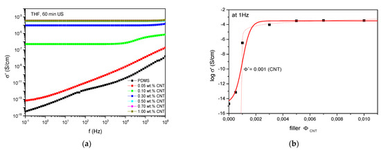 Regarding the effectiveness of the pre-dispersion step, the percolation threshold was determined which is defined as the minimum filler content where a filler network is built and the electrical conductivity rises drastically. The formation of these conductive paths and therefore the percolation threshold depend on many factors such as the geometry, the intrinsic conductivity, and the state of dispersion of the corresponding nanofillers [36,37]. Dielectric measurements depending on the CNT content show an increase in conductivity with increasing CNT amount (Figure 4a). At a filler level of 0.1 wt.% a drastic increase in conductivity arises and at contents around 0.5 wt.% a plateau of the dielectric conductivity of 3.6 × 10−4 S/cm is reached where no further increase in conductivity occurs at higher CNT amounts. This plateau is reached at an extremely low filler amount, which again indicates ideal filler dispersion due to this pretreatment step, as the filler amount where the plateau in electrical conductivity exists is based on the distances between the filler particles. Therefore, the formation of conductive pathways is developed at a comparatively low concentration and is in good agreement with [38]. The electrical percolation threshold (Figure 4b) was calculated in accordance with [11] and resulted in 0.1 wt.% of CNTs at 1 Hz (corresponding to filler–polymer volume fraction of Φ* = 0.001). As the initial electrical percolation threshold without any pretreatment amounts to 0.9 wt.% of CNTs (Φ* = 0.009) [11], this is a distinct decrease in CNT concentration and stresses the aforementioned claims.