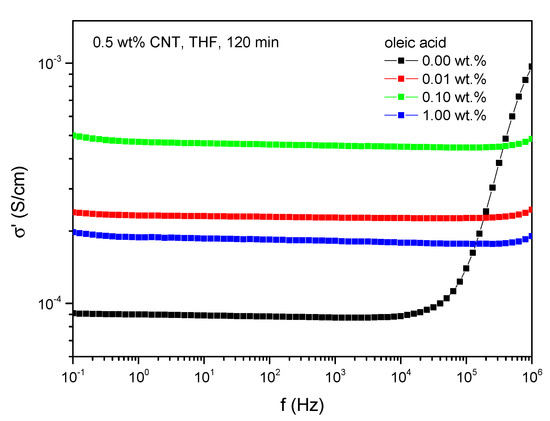 An additional concept of this study is to enhance polymer–filler interactions by increasing the compatibility of CNTs and PDMS as enhanced polymer–filler interactions superpose filler–filler interactions and therefore support agglomerate break-up. This can be realized by adding surface-active substances that are physically bonded on the filler surface and compensate polarity differences between filler and polymer. This procedure preserves the structure of the filler particles as the substances are bonded to the filler surface non-covalently which ensures to keep the properties of the filler. Oleic acid serves these criteria, which was added based on predispersion in THF. Figure 5 displays the dielectric conductivity of PDMS/CNT-composites with 0.5 wt.% CNT pretreated with sonication for 120 min with different concentrations of oleic acid. Adding oleic acid leads to a slight increase in conductivity, where the composites with 0.1 wt.% oleic acid and 0.5 wt.% CNTs reaches a conductivity of 5 × 10−4 S/cm at 1 Hz. Implementing higher concentrations of oleic acid decreases the conductivity, so that CNT dispersion is at an optimum using 0.1 wt.% of oleic acid.
