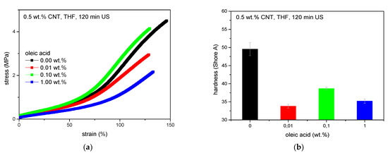 Mechanical experiments regarding the composites treated with oleic acid confirm best CNT dispersion when adding 0.1 wt.% oleic acid (Figure 6). In total, this method of pretreatment leads to a decrease in tensile strength and elongation at break compared to composites with merely pre-dispersed CNTs (Figure 6a). As the elongation at break decreases, softening due to solvent residues is not obvious. This implies that oleic acid covers the surface of the carbon nanotubes effectively which inhibits the adhesion of the solvent. In consequence, THF can be preferably removed in the vacuum processing step. Though, mechanical reinforcement cannot be observed, which is also approved by Shore A hardness (Figure 6b).