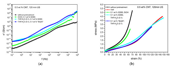 Composites with CNTs pretreated with surfactants, (a) dielectric conductivity and (b) stress–strain analyses.