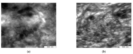 Stress–strain analyses likewise indicate a decrease in reinforcement implying deterioration in dispersion. Elongation at break values rise while the elastic modulus decreases at low strain. Surfactant and solvent residues account for the softening behavior, which is underlined by TEM images where surfactant residues can be observed in between CNT agglomerates (Figure 8). Compared to composites with CNT-predispersion solely in THF, pretreatment with SDBS in THF/H2O leads to an equivalent polymer–filler bonding apparent by the comparatively high tensile strength. Using “Brij35” in THF/H2O instead of SDBS, results in a material stiffness of the same level but decreased tensile strength and elongation at break implying impaired polymer–filler interactions.