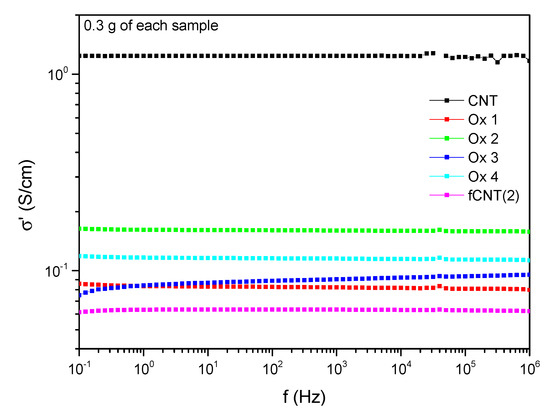 According to the results of [41] a decrease in the electrical conductivity of at least one decade is observed which can be assigned to surface defects and the damage of the CNTs (Figure 9). Comparing the different oxidation conditions, “Ox 2” shows only marginal CNT damage ending up in the highest remaining conductivity of 1.6 × 10−1 S/cm at 1 Hz. Regarding the functionalized CNTs based on the mild oxidation method 2, the conductivity is further decreased resulting in a conductivity level less than all oxidized samples. This indicates an additional change of the CNT structure due to the subsequent processing step of the functionalization process.