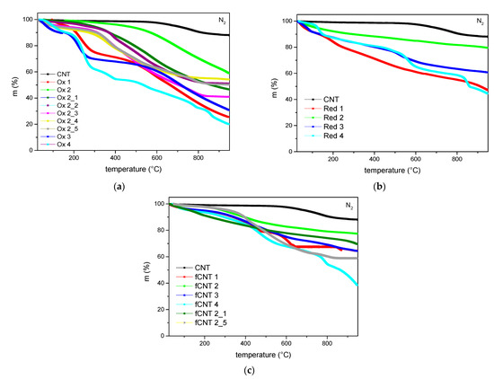 The curve characteristics and a relatively high remaining mass of 59% of the CNTs oxidized using method 2 confirm the lowest structural change by this modification process, whereas a higher number of functional groups on the surface can be observed for oxidation method 1, 3, and 4 (Figure 10a). The latter ones also represent a high loss of mass at relatively low temperatures which can be assigned to adsorbed molecules like oxygen. Comparing the oxidation conditions that varied within the series of oxidation method 2, the initial parameters using a reaction temperature of 75 °C for 180 min preserve the surface structure of the carbon nanotubes best. The modification toward milder conditions results in an increased incineration throughout the thermal gravimetric experiment indicating inadequate reaction conditions during the oxidation process and an increase in functional groups on the CNT surface instead. Further processed samples like reduced and functionalized CNTs (Figure 10b,c) predominately show the same progression with regard to their base oxidation method. Overall, the results confirm that applying oxidation method 2 for further processing leads to the slightest structural change and is therefore preferred.