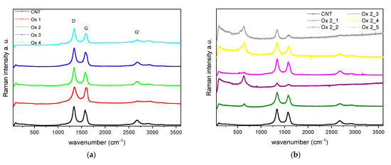In order to investigate functional groups and surface defects of the CNTs, Raman-spectra (Bruker Senterra Raman Microscope, Billerica, MA, USA) were recorded using the following parameters: Acq. 10 s × 5 loops, obj. 50×, λ = 532 nm, P = 2 mW, Ap: 50 × 1000 µm, Res: 3–5 cm−1, Range: 50–1555 cm−1, T = 21.8 °C, H = 42%.