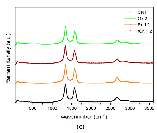 Raman-spectra of (a) oxidized, (b) reduced, and (c) functionalized CNTs.