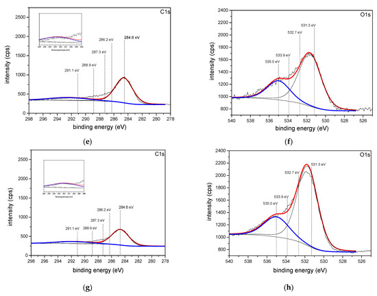 XPS analyses of carbon (C1s) and oxygen (O1s) areas of CNTs, (a) + (b) pristine CNTs, (c) + (d) oxidized according to “Ox 2”, (e) + (f) oxidized according to “Ox 2_3” and (g) + (h) oxidized according to “Ox 2_5”.