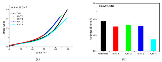 The approach of the functionalization step was to increase the compatibility between filler and polymer and therefore the polymer–filler interactions to simultaneously decrease the filler–filler interactions and to increase the filler dispersion by this. As the conductivity level is extremely reduced in functionalized CNT/PDMS composites, a potential benefit in dispersion cannot be observed here and the effect is superimposed by the decrease in conductivity due to CNT defects. Hence, mechanical analyses were performed to examine a potential increase in polymer–filler interactions due to the functionalization process (Figure 14).