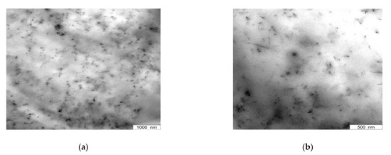Compared to CNT/PDMS-composites where merely the pre-dispersion step was performed, a decrease in tensile strength and elongation at break can be seen for all functionalized samples, especially those based on oxidation method 1. Regarding stress–strain curves and hardness measurements, oxidation methods 2 and 3 taken as basic strategy for the functionalization result in a comparatively little decrease in the mechanical performance. This is in good accordance with the results obtained by Raman spectroscopy. Though, no enhancement in reinforcement or hardness can be observed due to functionalization. This is contrary to the expectations since the modification of the CNTs was performed to improve the compatibility between filler and polymer by reversing the polarity of the CNT surface due to the application of alkyl chains [35]. In addition to the change in polarity, the terminal double bond of the alkyl chains enables to form covalent bonds to the polymer during the addition cured vulcanization process which further enhances the bonding of the CNTs to the PDMS. Therefore, CNT damage is likely to occur which was assumed regarding the electrical conductivity results already. To consider this in detail, TEM images were recorded to have a microscopic insight in the nanoscale. Hereby, a reduction in tube lengths can be seen in CNT/PDMS-composites where the CNTs were oxidized using method “Ox 2” (Figure 15) compared to composites where simply pre-dispersion in THF was performed (Figure 3d). The aspect ratio decreases due to the oxidation process which proves the assumption of CNT damage. Besides this, good dispersion with only minor CNT-clusters can be observed here verifying agglomerate break-up. Therefore, reduced filler–filler interactions and enhanced polymer–filler interactions are indicated which are superimposed by CNT damage. Finally, the functionalization result in a decrease in electrical and mechanical performance of the composite as the CNT damage is the predominant effect.