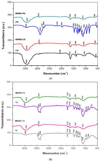 FTIR spectra of samples: (a) chitosan (CS), MWBA-CS, polyethylene glycol (PG), MWBA-PG and (b) Tween 20 (T2), MWBA-T2, Tween 80 (T8) and MWBA-T8.