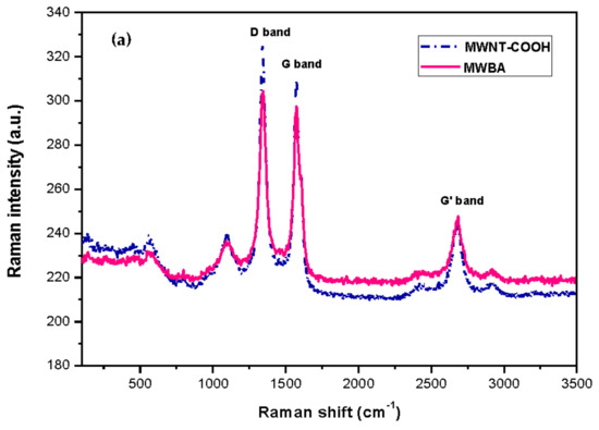 Figure 3a illustrates the Raman spectrum of carboxylated MWNT and BA-loaded MWNT for comparison purposes. As can be observed in the Raman spectrum, the main Raman signature bands occurred at 1342 (D band), 1575 (G band) and 2681 (G’ band) cm−1. The D band is defect activated Raman mode, suggesting that the samples were not of a complete crystalline graphitic material and that they contained a high amount of defect structures. The presence of the G band (E2g symmetry) confirmed that all samples were composed of sp2 carbon networks, which is the essential feature of CNT. The G’ band, which is associated with the stacking order and the number of graphene layers, was clearly seen in the Raman spectrum as a result of interactions between stacked graphene layers. Furthermore, a relatively weak band belonging to the disordered graphitic lattice (A1g symmetry) was seen near 1100 cm⁻1. The same band was also observed by other teams, and the authors provisionally assigned it to the stretching vibrations of double and single carbon-carbon bonds in polyene organic compounds or carbon sp2-sp3 bonds [44,45]. Lastly, the RBM was not detected in the nanotubes as the signals were too weak to be observable. Besides, this characteristic phonon mode is not a common feature for large diameter tubes such as MWNT.