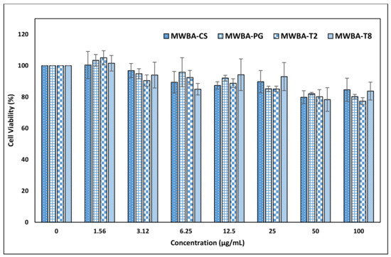 For cytotoxicity assay, NIH/3T3 cells were seeded (10,000 cells/well) in a 96-well microplate and maintained for 1 day at 37 °C (5% CO2 and 95% air) to allow for cell attachment. The cells were exposed to different concentrations of biopolymeric MWBA nanocomposites for 72 h and further incubated with MTT solution (20 μL, 5 mg/mL in PBS) for another 3 h. Thereafter, excessive MTT reagent was discarded and the purple formazan crystals formed in the assay were solubilized with DMSO (200 μL). The absorption was recorded at 570 nm against 630 nm as a reference wavelength using an EL 800X microplate reader (Winooski, VT, USA). The following formula was used to determine the absorbance value which is directly proportional to the cell viability. All MTT assays were repeated in triplicate.