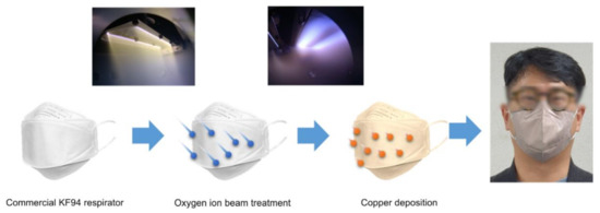 Various studies have demonstrated that the risk of secondary transmission from the use of reusable masks can be minimized by the application of antiviral substances. For example, one type of mask has been found to be safe after as many as 50 uses when sterilized with high-temperature steam [17]. Washable fabrics such as silk have been proposed as a replacement for polymer-based N95 respirators [15,18]. Plasmonic photo-thermal heating has also shown promising results for the development of self-decontaminating respirators [19,20]. In addition, the antiviral effect of certain metals has been demonstrated using N95 respirators [21]. Specifically, the antiviral activity of copper is well-known [22,23,24,25]. Copper cations readily capture negatively-charged bacteria and viruses and can penetrate virus-infected bacteria. This activity prevents viral replication and infection functions. Silver and zinc oxide-based antimicrobial substances have also been widely used, and their application to respirators has been investigated [26].