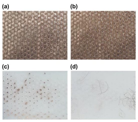 Tape adhesion testing of KF94 masks. Digital photographs of the copper-coated mask surfaces (a) without and (b) with oxygen ion beam pretreatment and of the surface of the removed tape (c) without and (d) with oxygen ion beam pretreatment.