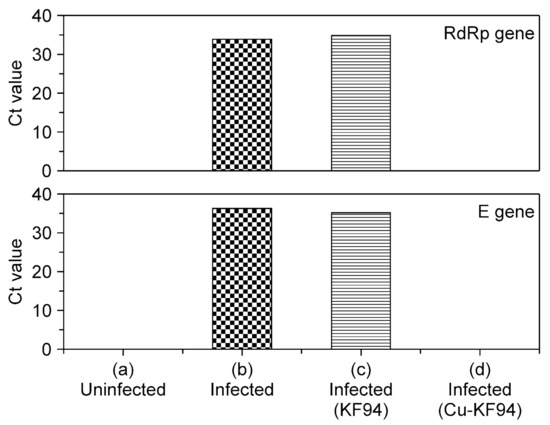 The real-time PCR results for the RNA-dependent RNA polymerase (RdRp) and envelope (E) genes confirmed the antiviral activity of the copper-coated KF94 against the SARS-CoV-2 virus (Figure 4). The medium containing SARS-CoV-2 virus (NCCP 43328) was diluted by a factor of 10−5, and 500 μL was applied to the uncoated and copper-coated spunbond PP filters for 1 h (Figure S2). Vero cells were then infected using PP filters that had been treated with the virus for 1 h. A MOI of 0.01 was used for the infection media, as per maintenance media, i.e., only 2% fetal bovine serum (FBS) was added. Untreated spunbond PP and uninfected Vero cells were used as controls. The efficacies were evaluated based on quantification of viral copy numbers in the cell supernatant via quantitative real-time reverse transcription PCR (qRT-PCR). The findings were confirmed by visualization of virus nucleoprotein (NP) expression using immunofluorescence microscopy at 48 h post infection (p.i.). The cytopathic effect was not obvious at this point. Real-time analysis was performed on cell-associated viruses using probes for the RdRp and E genes. The threshold cycle (Ct) values of these SARS-CoV-2 genes after contact with the uncoated spunbond PP for 1 h were similar to those of control SARS-CoV-2 samples. However, the RdRp and E genes of SARS-CoV-2 were not detected after 1 h of contact with the copper-coated spunbond PP, as for the uninfected cells. Thus, qRT-PCR demonstrated that the copper-coated spunbond PP filters inactivated the SAR-CoV-2 virus.