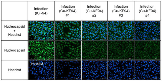 The SARS-CoV-2 nucleocapsid immunochemical fluorescence signal was also used to demonstrate the antiviral ability of the copper-coated PP filters (Figure 5). Vero cells were infected with SARS-CoV-2, and immunofluorescent staining of the nucleocapsids was performed, with the nucleocapsid and Hoechst stains being observed as green and blue fluorescent emissions, respectively. The Hoechst stain was used to stain DNA, allowing identification of the cell nuclei. The uncoated KF94 control sample exhibited bright green nucleocapsids, while the nucleocapsid expression of SARS-CoV-2 was reduced by 75% in the copper-coated KF94 samples (n = 4). These in vitro results confirmed that the copper-coated PP filter had excellent antiviral activity against the SARS-CoV-2 virus. Accordingly, it is expected to be highly effective in the control of COVID-19 infection.
