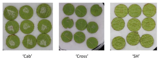Grapevine downy mildew symptoms on leaf disks with different sporulation density observed at 7 days post-inoculation. “Cab”: Vitis vinifera cv. “Cabernet sauvignon”; “SH”: Vitis amurensis cv. “Shuanghong”; “Cross”: the hybrid from “Cab” and “SH”.