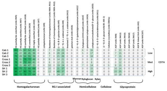 Comprehensive Microarray Polymer Profiling (CoMPP) analysis of CDTA extract of grapevine leaf cell wall AIR samples. The heatmap shows the relative abundance of plant cell wall glycan-associated structural motifs. The highest signal was set as 100, and others were adjusted accordingly; the color intensity is correlated to the mean spot signal. A cut-off (<5) was applied.